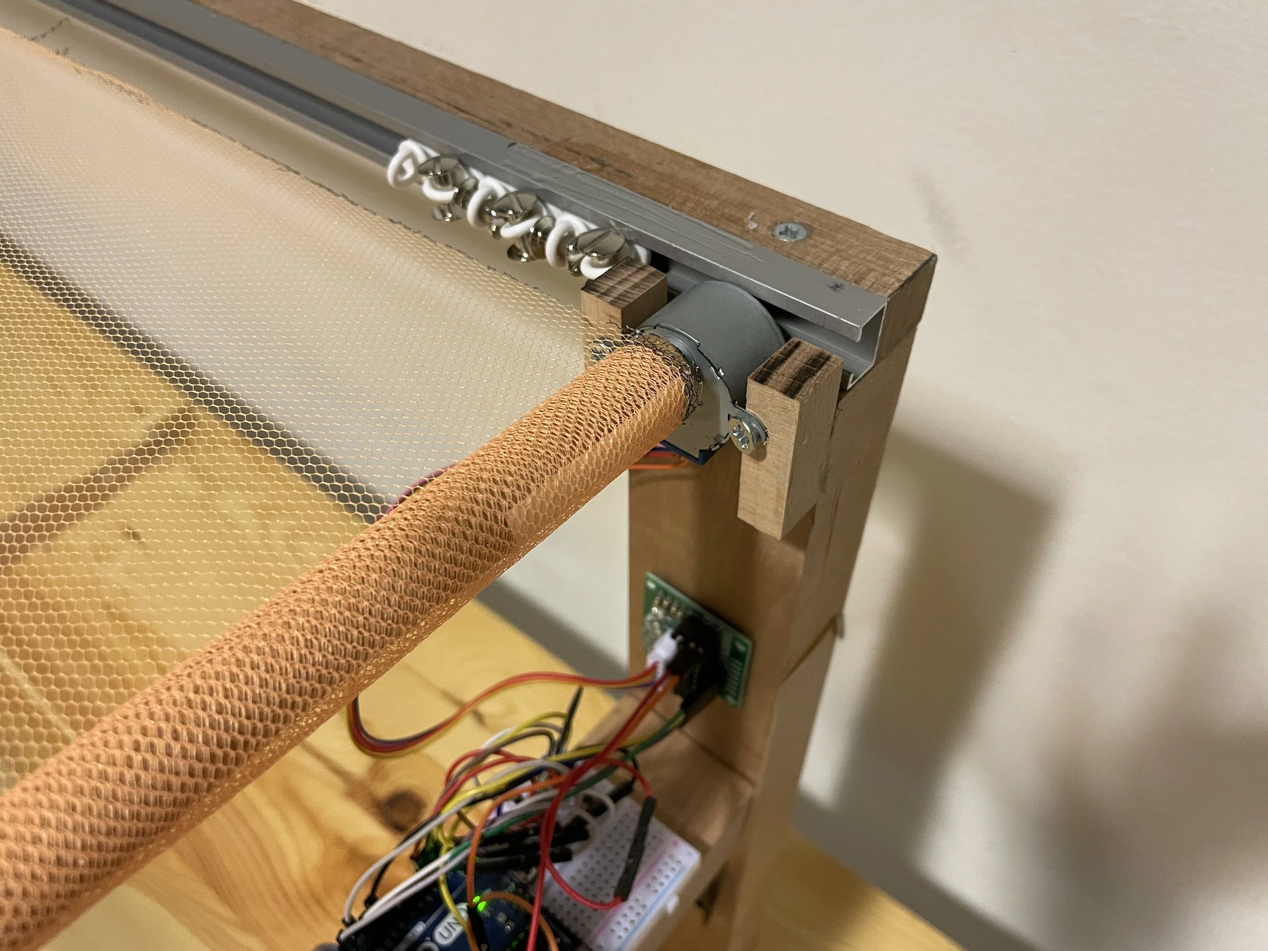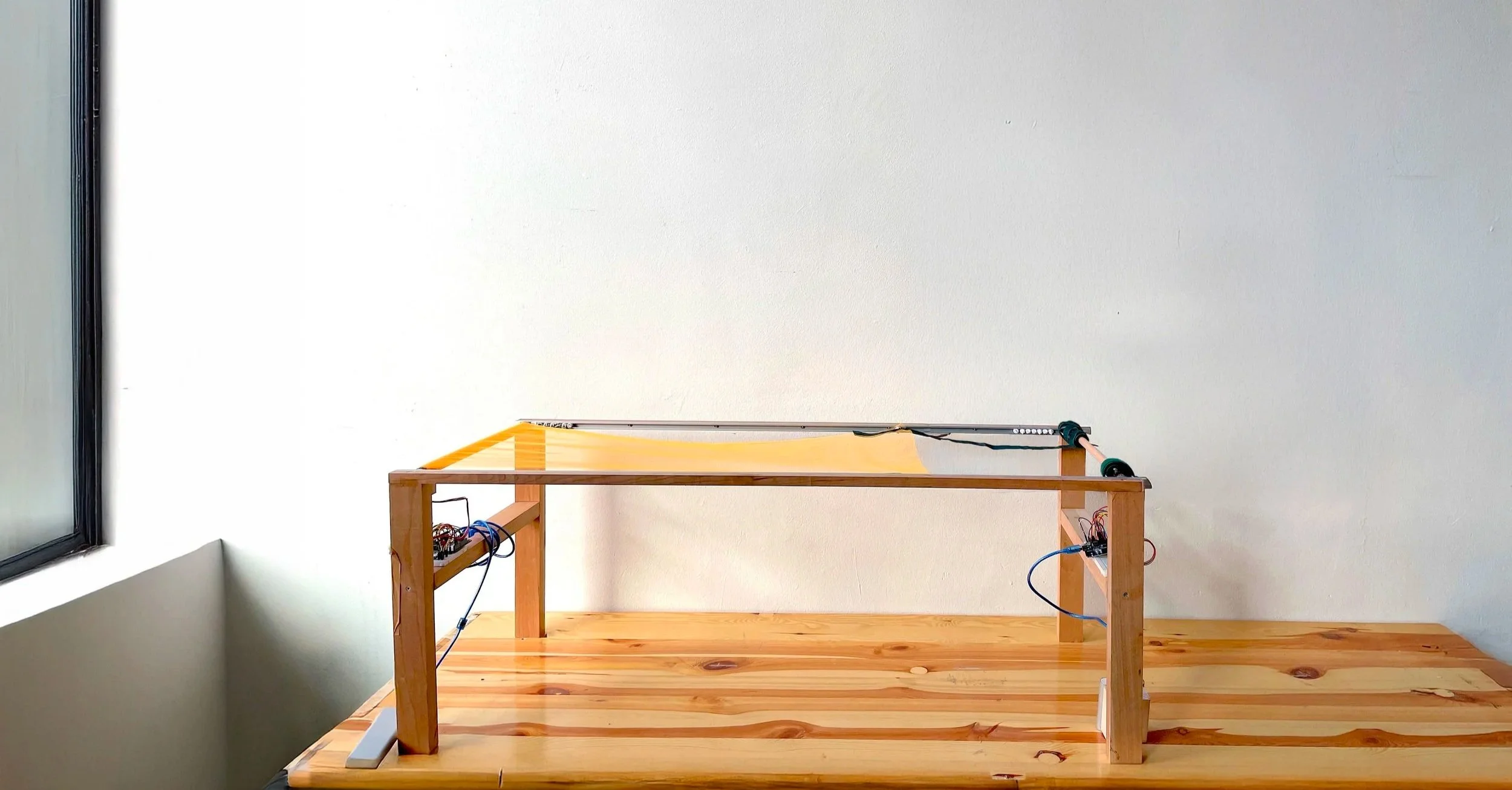 Real-world scale model constructed from cherry wood, nylon net, metal sliders, motors, a liquid sensor, and a temperature sensor.