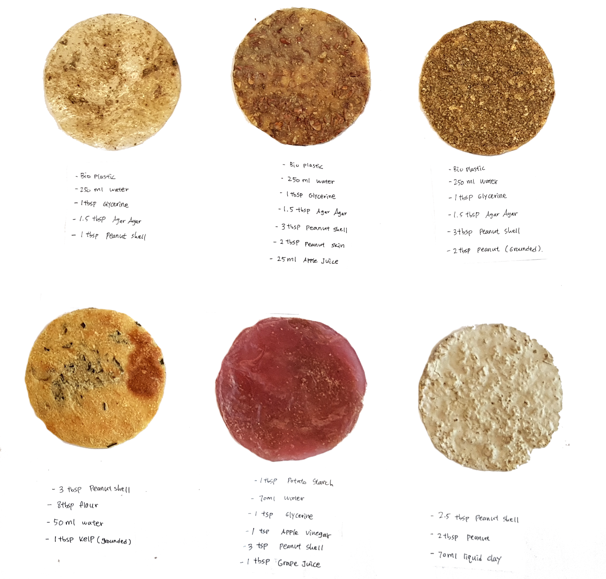 The plastic becomes stronger when I add more peanut shells. The materials I used for the improved samples are flour, honey and juice (in addition of peanut ofcourse)